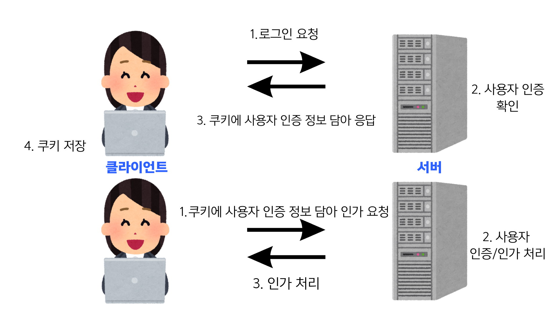 ์ฌ์ฉ์์ ์ธ์ฆ ์ ๋ณด๋ฅผ ์๋ฒ๊ฐ ์ ์ฅํ์ง ์๊ณ , ํด๋ผ์ด์ธํธ๊ฐ ์ ์ฅํ ํ ์์ฒญ๋ง๋ค ์ธ์ฆ ์ ๋ณด๋ฅผ ์ฟ ํค์ ๋ด์ ๋ณด๋ด๋ ๋ฐฉ์์ ๋๋ค.