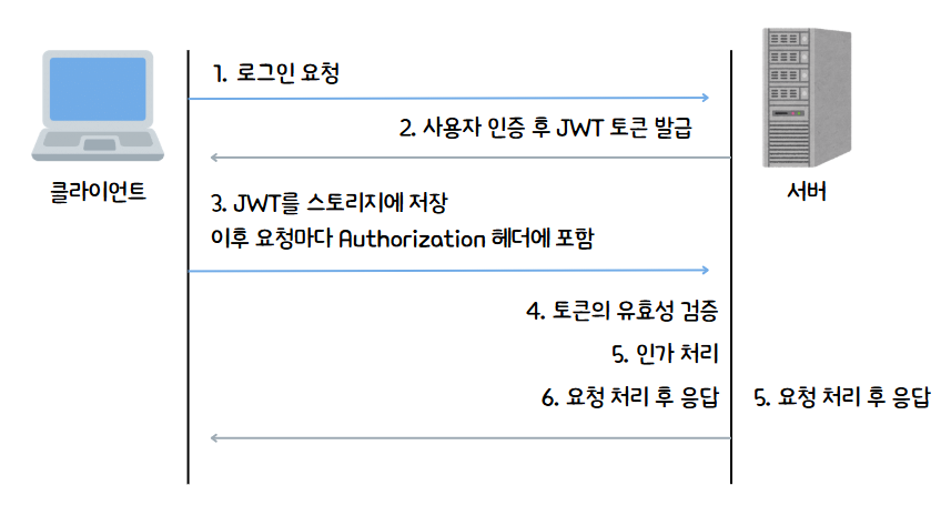 ν΄λΌμ΄μΈνΈκ° ν ν°μ HTTP ν€λμ μ€μ΄ μλ΅μ λ³΄λ΄ μλ²κ° ν΄λΌμ΄μΈνΈλ₯Ό μλ³νκ³ μΈμ¦/μΈκ°λ₯Ό μνν©λλ€.