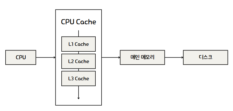 CPU Register -> L1 Cache -> L2 Cache -> L3 Cache -> λ©μΈ λ©λͺ¨λ¦¬(RAM) -> λμ€ν¬
