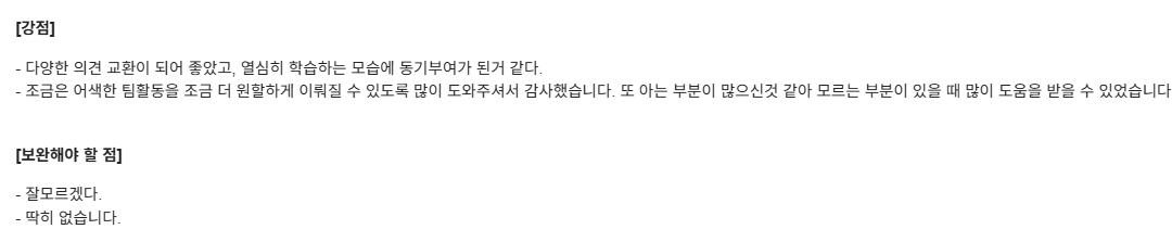 ํ๋ก์ ํธ๋ฅผ ํ๋ ค๊ณ ์์ํ ๊ณผ์ ์ธ๋งํผ ์ ๊ทน์ ์ผ๋ก ํ ํ๋์ ์ฐธ์ฌํ๊ณ , ์ ๊ทน์ ์ผ๋ก ์๊ฒฌ์ ๋ด๋ ค๊ณ ํ๋ค.