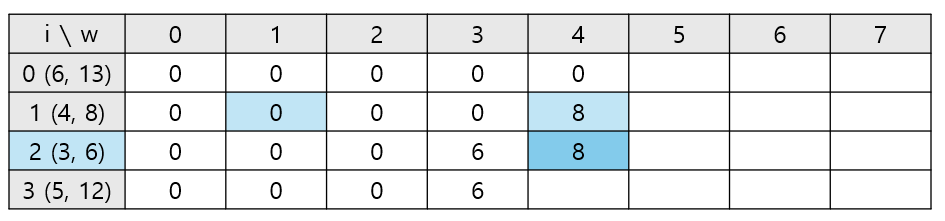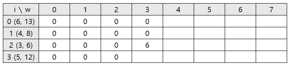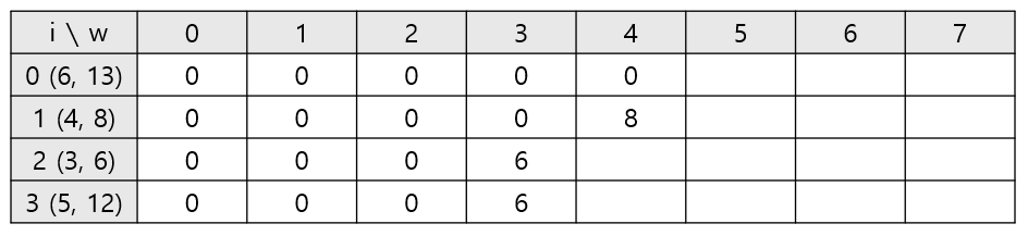 ์ด์ 1๋ฒ์งธ ๋ฌผ๊ฑด๊น์ง ๊ณ ๋ คํ์ ๋ ๊ฐ = 8 vs ํ์ฌ ๋ฌผ๊ฑด์ ๊ฐ์น(6) + ๋จ์ ๋ฌด๊ฒ 1์์ 1๋ฒ์งธ ๋ฌผ๊ฑด๊น์ง ๊ณ ๋ คํ์ ๋ ์ต๋์น(dp[1][0]) = 6 ์ผ๋ก max = 8์ด ๋ฉ๋๋ค.