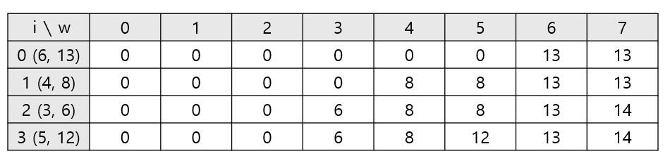 (์ฒซ๋ฒ์งธ๋ถํฐ i๋ฒ์งธ๊น์ง ๋ฌผ๊ฑด์ ๋ค ๋ฃ๋ ๊ฒ ์๋๋ผ ๊ทธ ์ค์์ ๊ฐ์น๊ฐ ๊ฐ์ฅ ํฐ ์กฐํฉ์ผ๋ก ๊ตฌํ ๊ฐ์น์ ๊ฐ๋ง ๊ธฐ์ตํ๋ฉด ๋ฉ๋๋ค.)